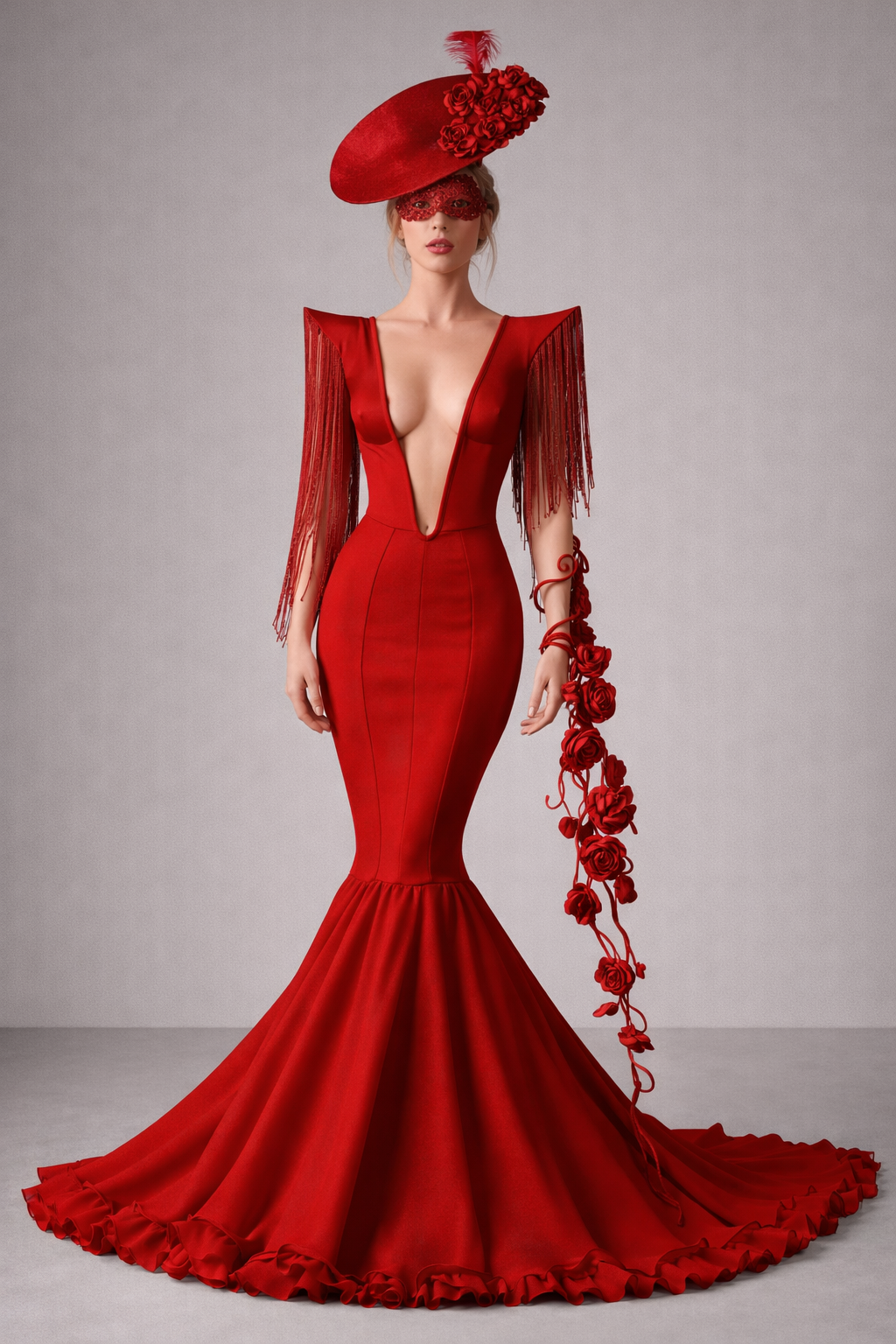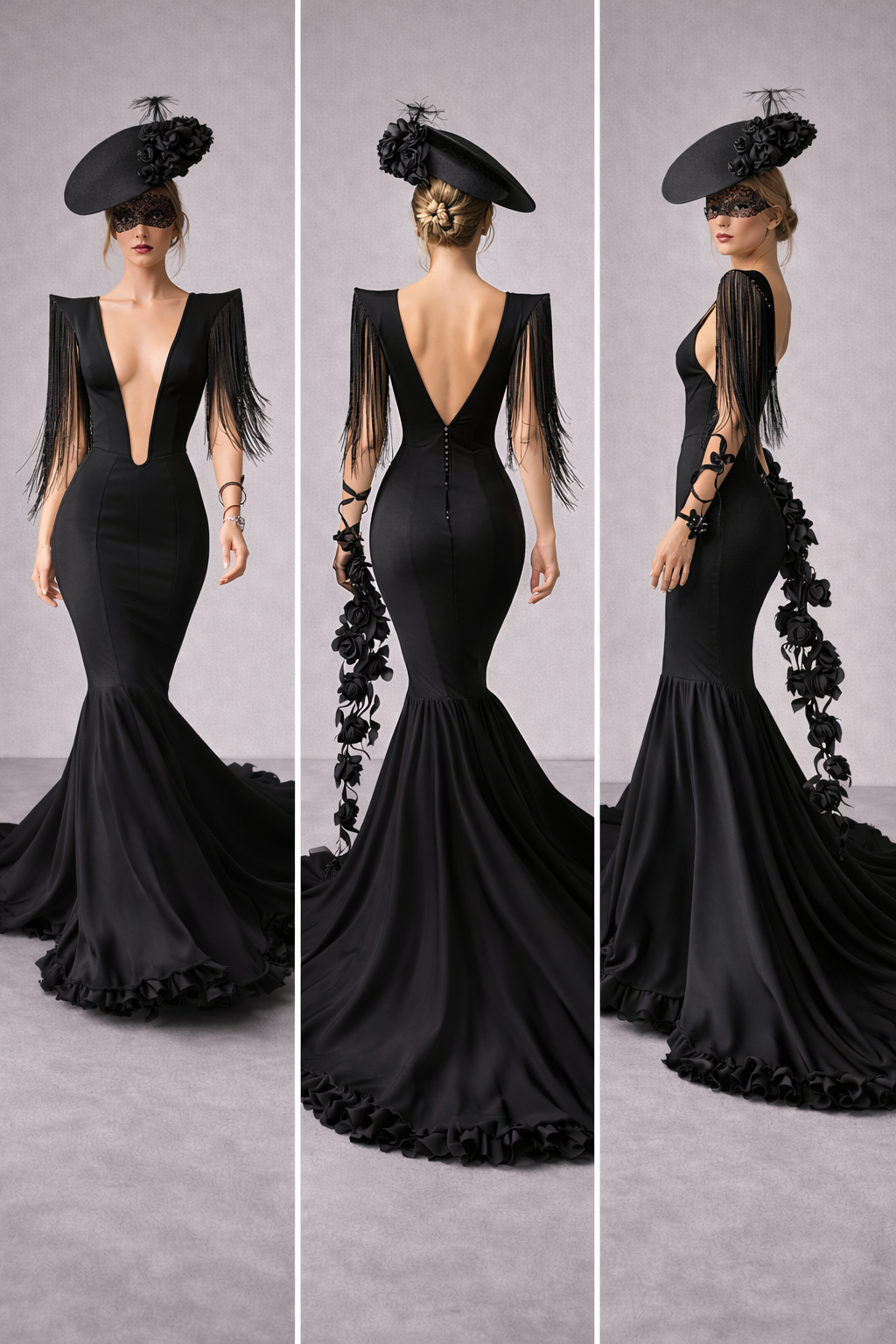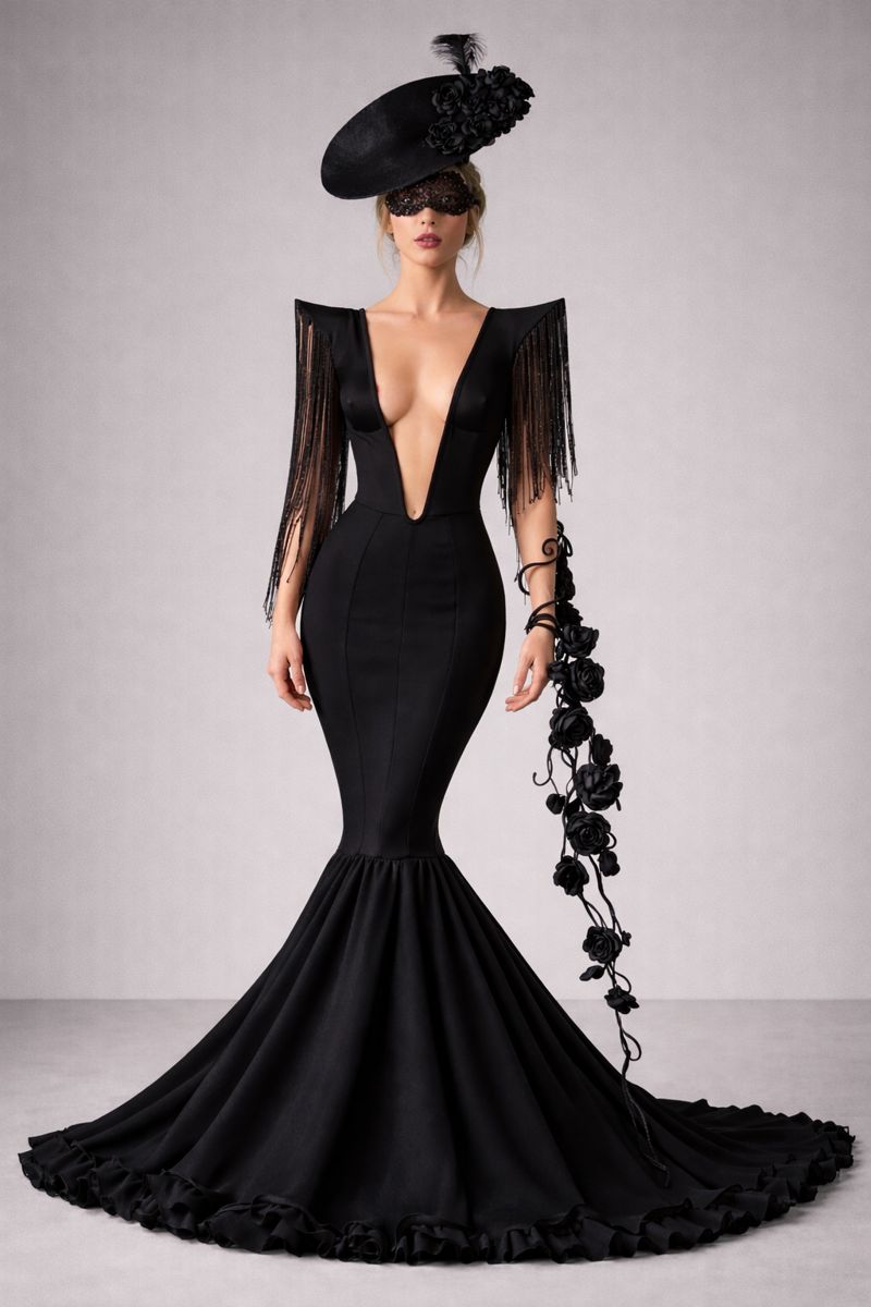 La silhouette sirena scolpisce il corpo in una linea potente e sensuale, esaltando la figura con un equilibrio tra struttura e movimento. Lo scollo profondo a V crea una tensione elegante tra rigore e seduzione, mentre le spalle architettoniche e le frange fluide aggiungono teatralità e dinamismo ad ogni passo.